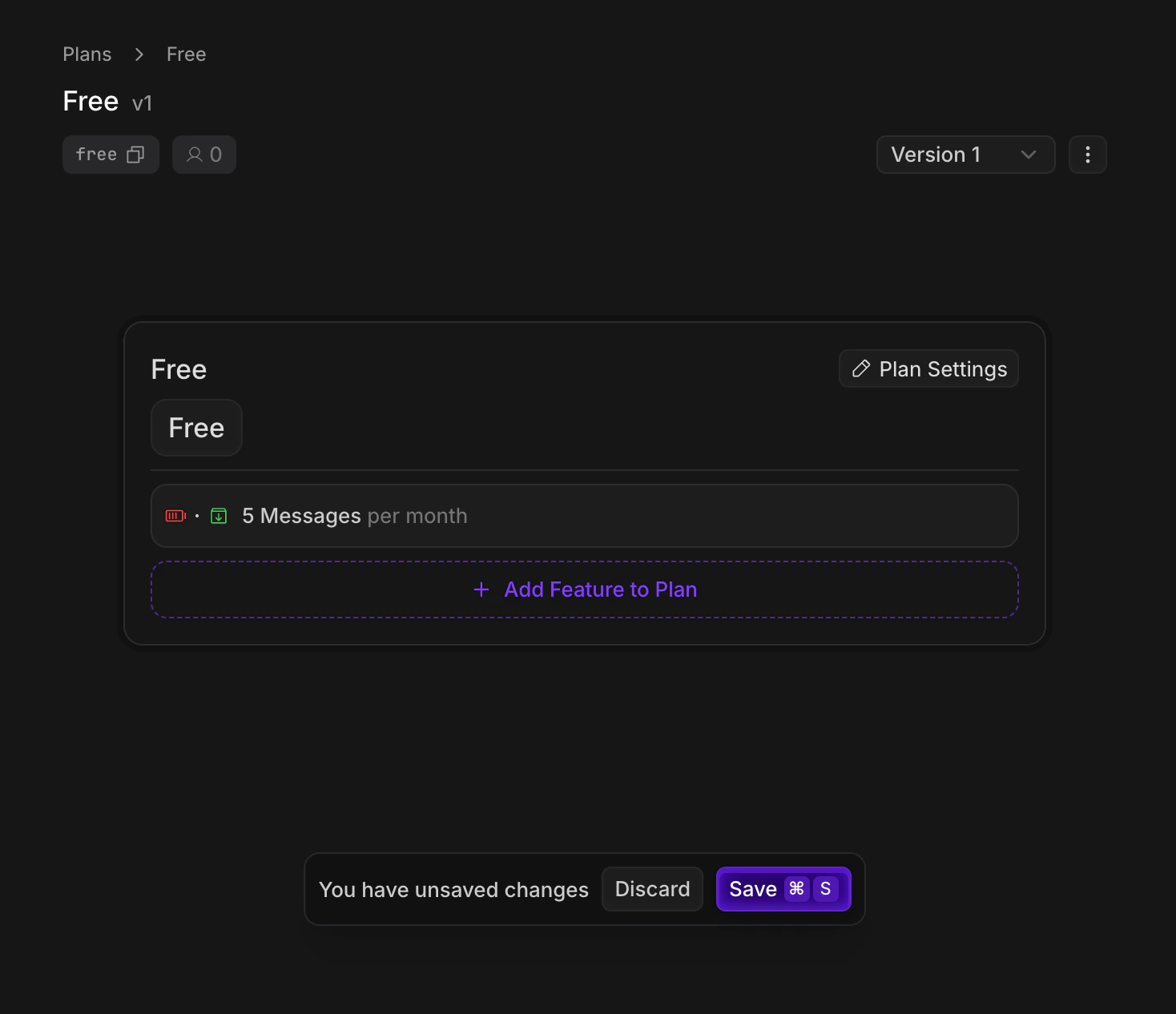 auto-enableflag, so that the plan is assigned whenever customers are created - In the plan editor, click Add Feature to Plan, and create a