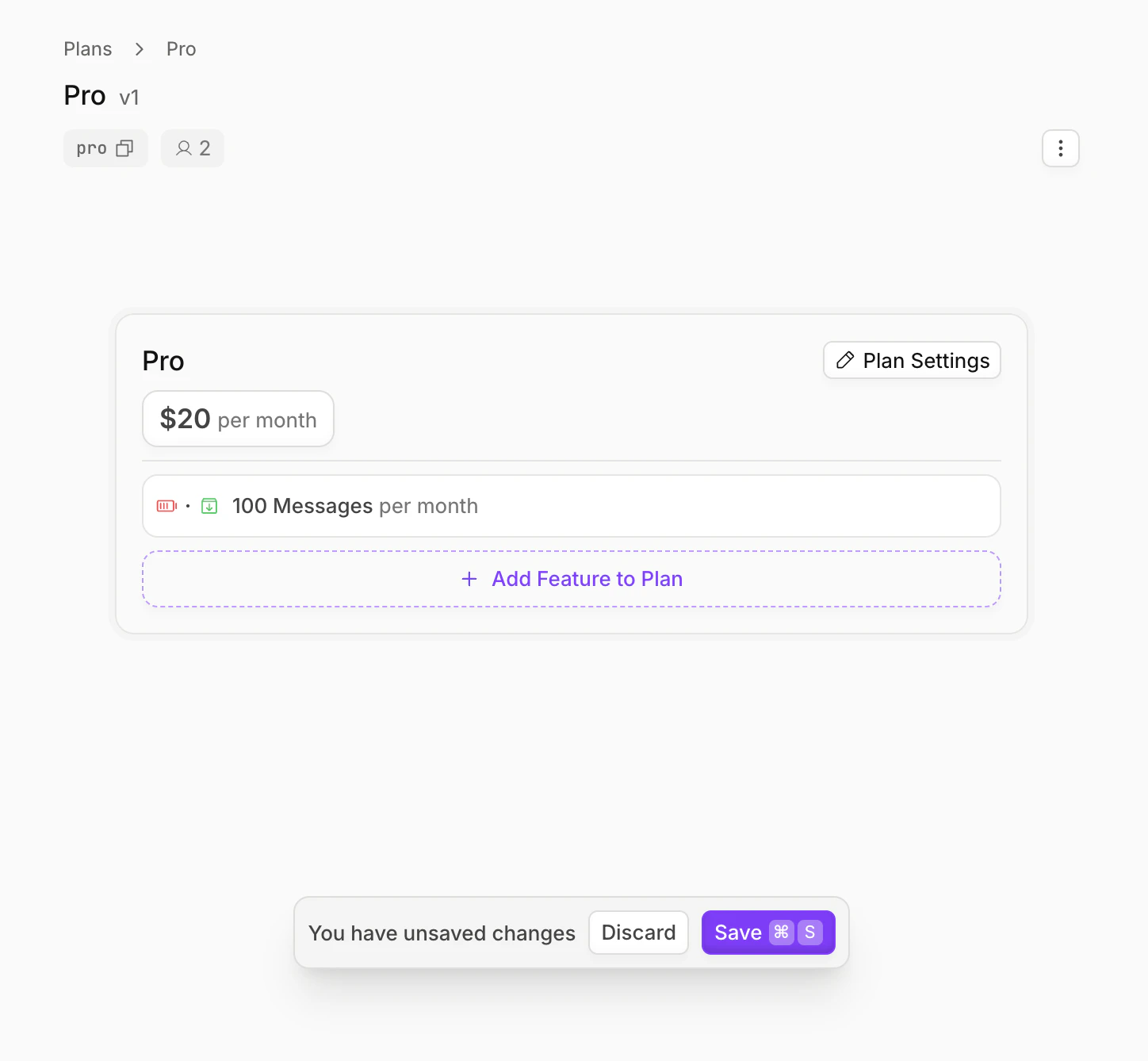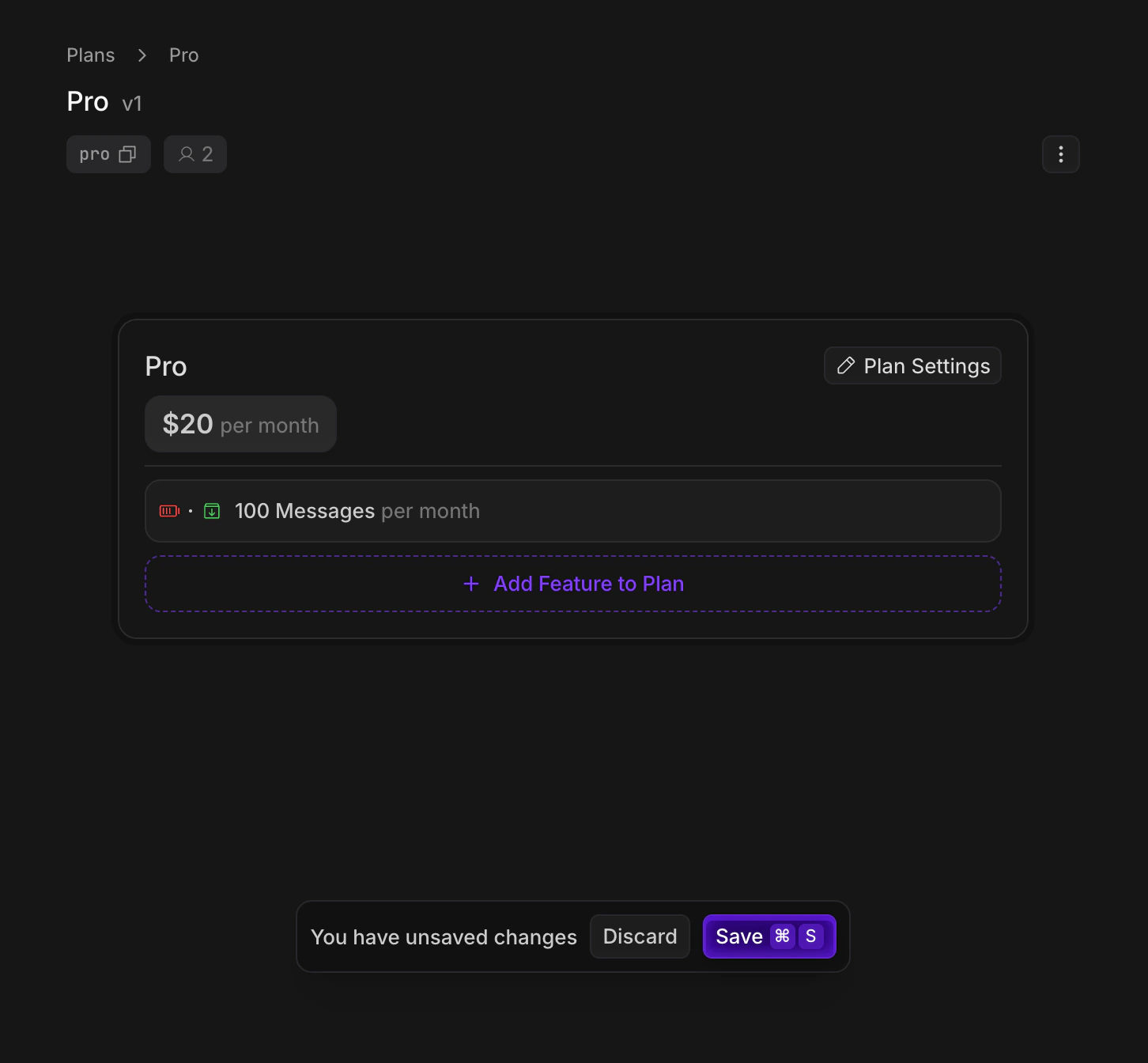 Paid,Recurring, and set the price to$20per month - In the plan editor, click Add Feature to Plan, and add the