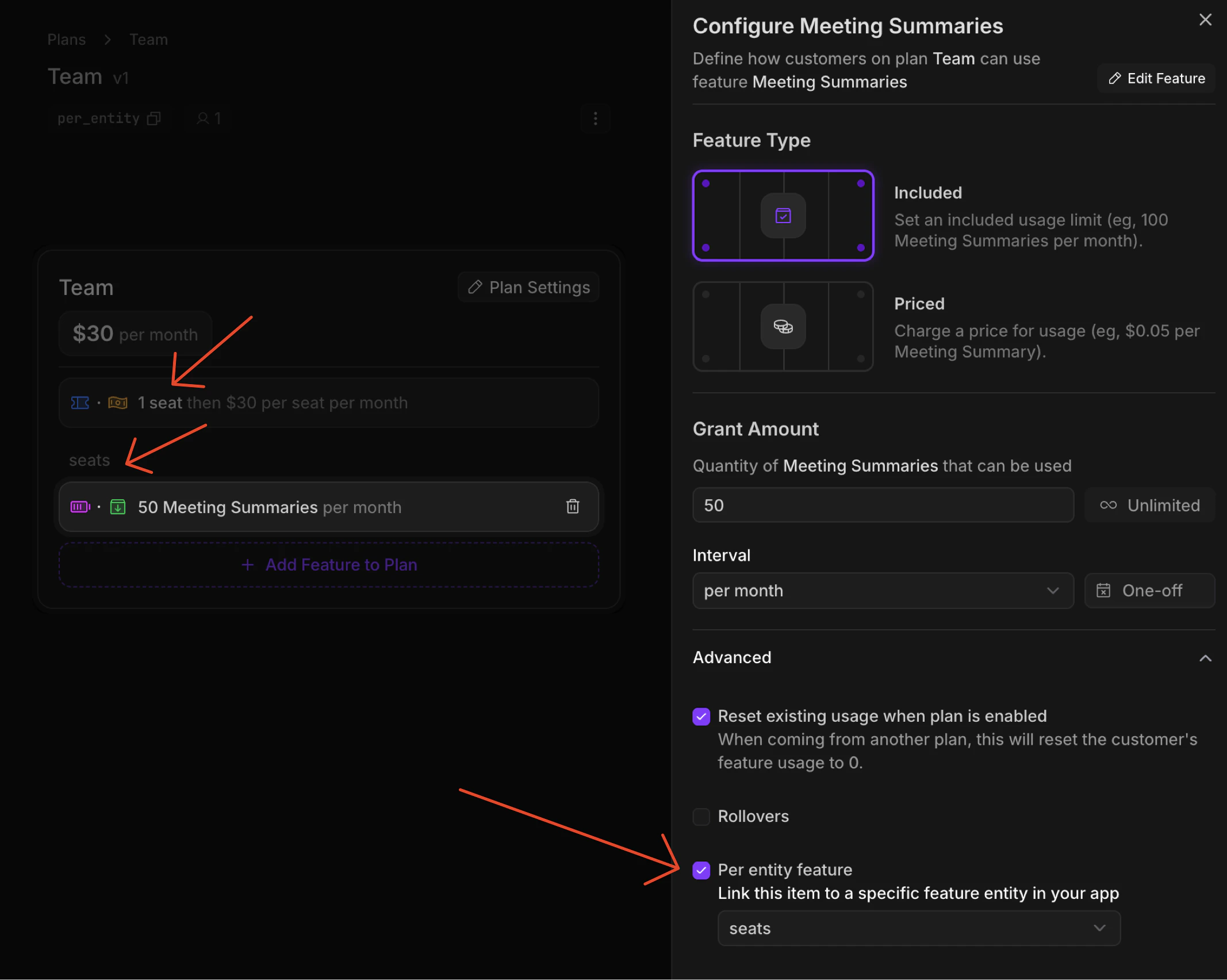 - Meeting Summaries: 50 per month, linked to the Seats feature as a per-entity feature, under “Advanced”