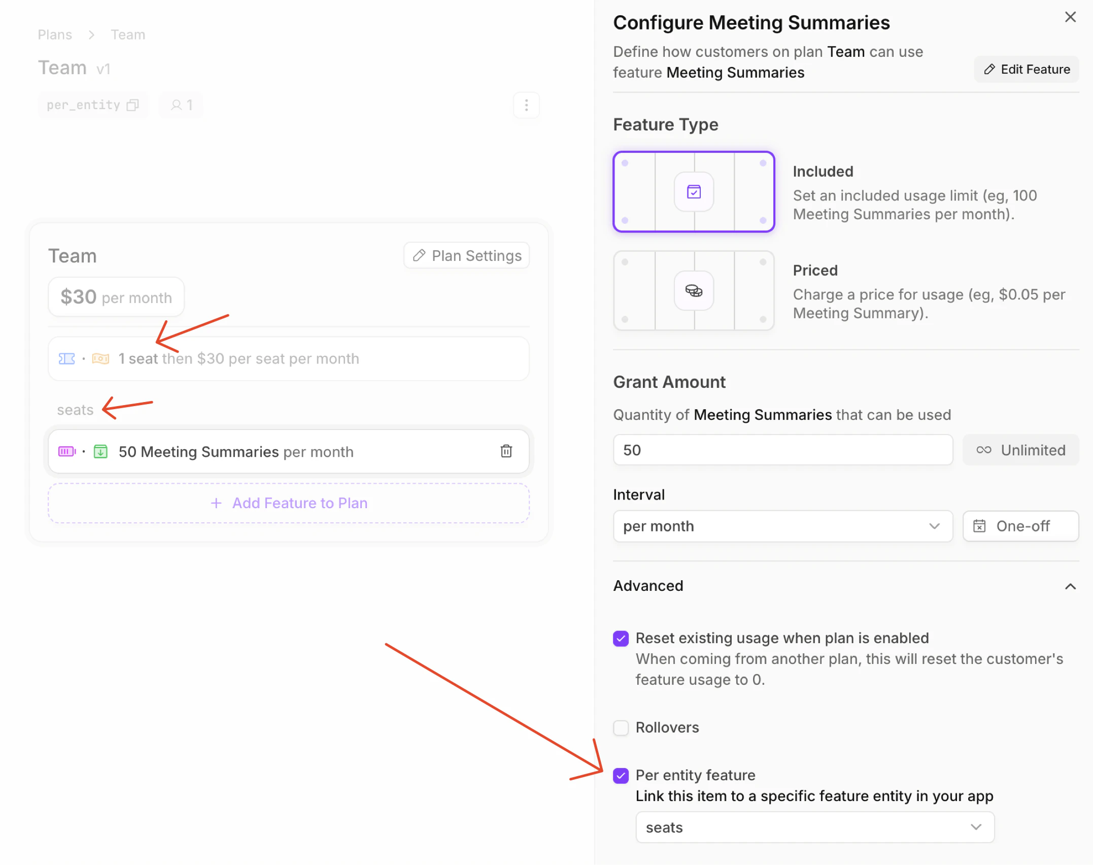When the customer upgrades to Team, attach the plan. The checkout URL will show the $30 base price.Create Entities (Seats)