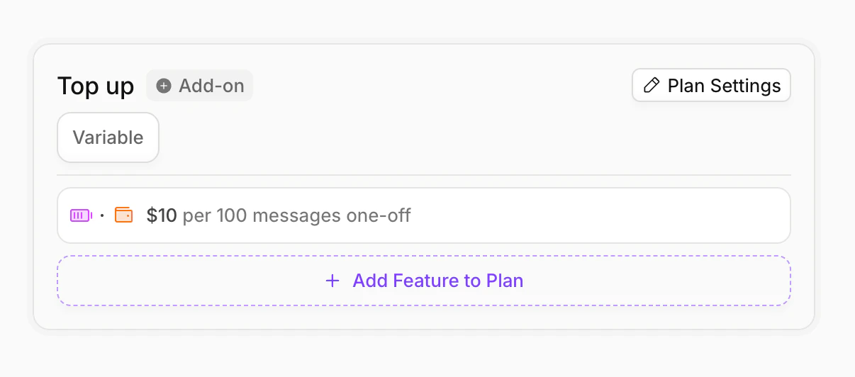 prepaid price of $10 per 100 messages.Since these messages have interval “one-off”, the messages will last forever (unlike our Free plan messages, which reset every month).Features with a prepaid price require a quantity to be passed in when a customer purchases the plan, so the customer can specify how many messages they want to top up with.