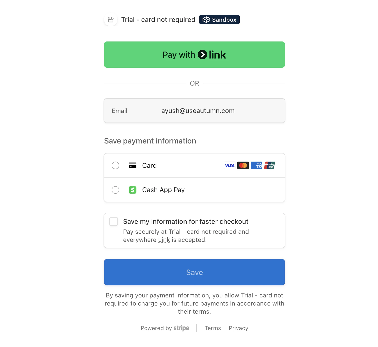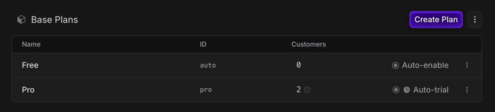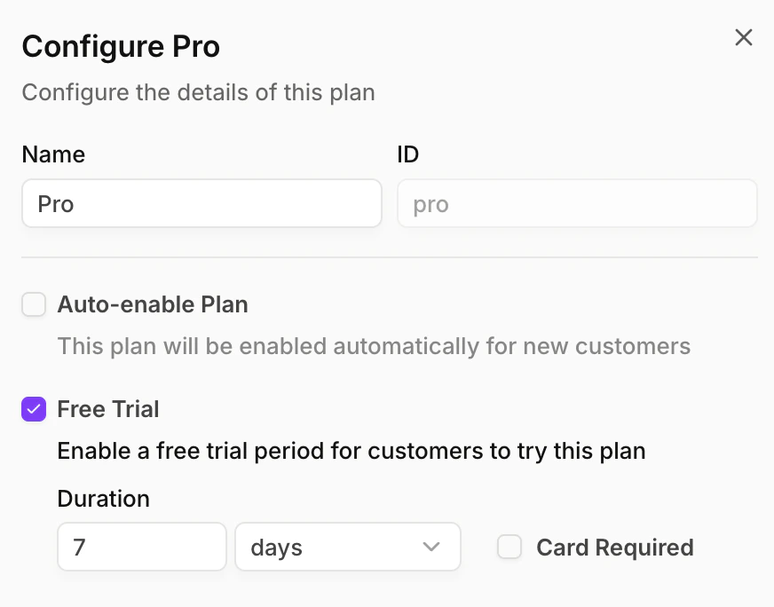 Attach the plan to the customer to enable the trial. Since no card is required, no checkout is needed. If you switched the “auto-enable” flag to true, you can skip the attach step as the trial will be automatically applied to newly created customers.The trial will only be applied once per customer.